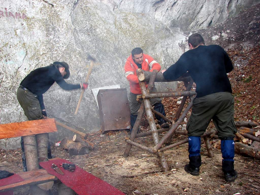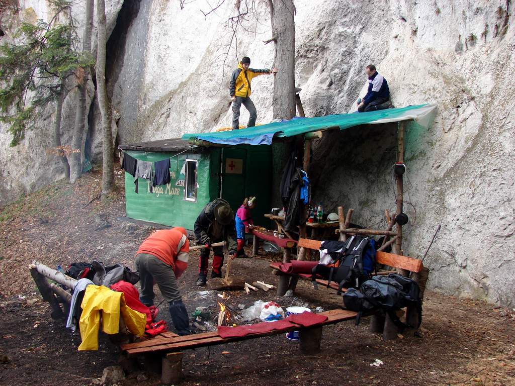 Ajunşi la refugiu lăsăm bagajele grele din spate pe băncile din jurul locului pentru foc. Ne tragem sufletul câteva minute studiind faleza ce se ridică deasupra refugiului. Claudiu ne arată traseele de căţărat şi împrejurimile. Ne apucăm de lucrurile pentru care am venit aici. În primul rând trebuie dublat acoperişul la terasa refugiului. Materialele sunt suite sus pe scheletul deja confecţionat. Raul şi Mişu lucrează la înălţime: aşează şi prind acoperişul în şuruburi. După ce termină această operaţiune Raul dă cu bitum pe acoperişul de la refugiu. Restul lumii – care după lemne care după apă – sau ca mine căutând să amenajez o faleză de antrenament pentru TSA cât şi pentru căţărat.