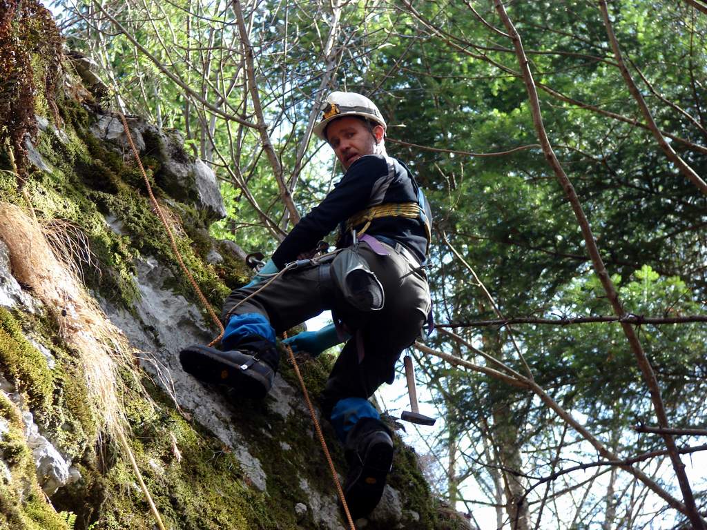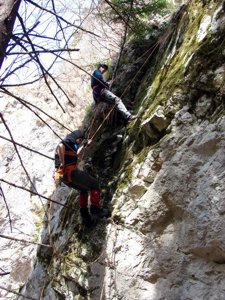 sub prag se surplombează, peste prag e aproximativ vertical. Am făcut amaraj pe unul din copaci dintr-o buclă de chingă. Am coborât de aici chiar peste buza stâncii, aici am plantat primul piton şi am făcut prima fracţionare. Coborând mai departe am curăţat peretele de bolovanii mişcători. În buza pragului mai sus amintit am bătut al doilea piton şi am făcut a doua fracţionare. Aterizarea pe pământ după coborârea porţiunii surplombate a fost o adevărată plăcere :). Paralel am montat şi o coardă simplă pe care începătorii să poată să exerseze rapelul fără prea multe complicaţii.