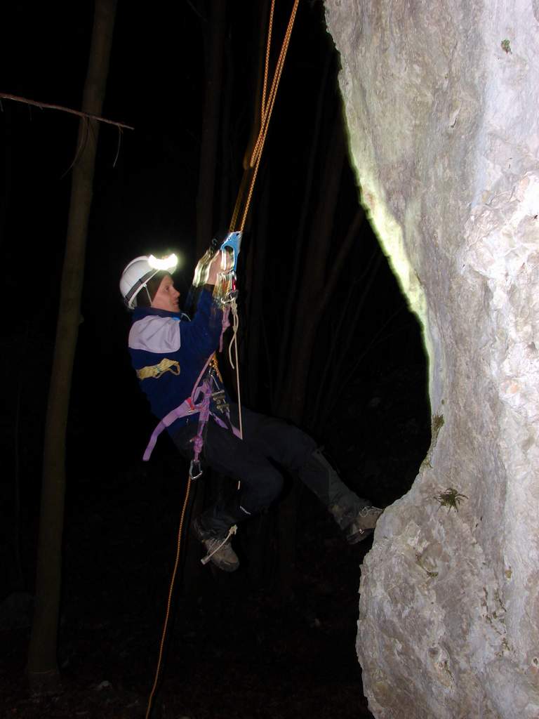 După o masă bine meritată am continuat cu schimbul execiţiile, până seara târziu. Pentru ca aranjamentul să fie cât mai aproape de ceea ce poate fi o peşteră, am făcut un ciclu de coborâre/urcare şi după lăsarea întunericului, la lumina frontalelor. Dezechiparea s-a făcut în aceleaşi condiţii.